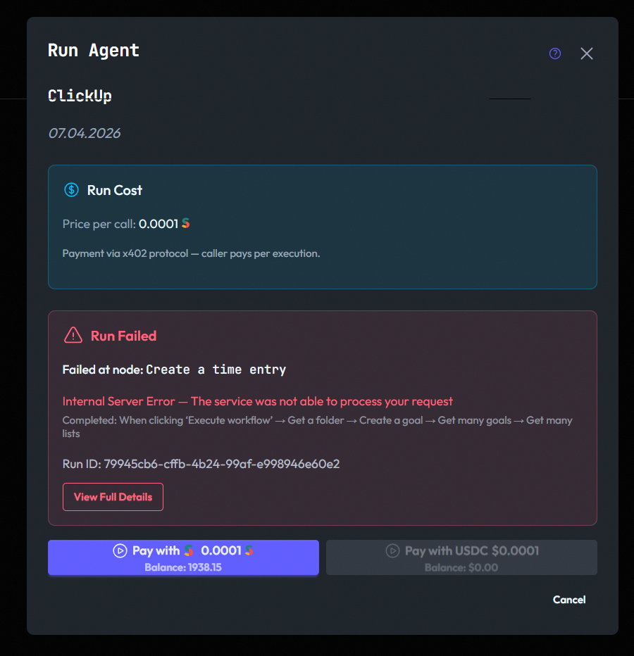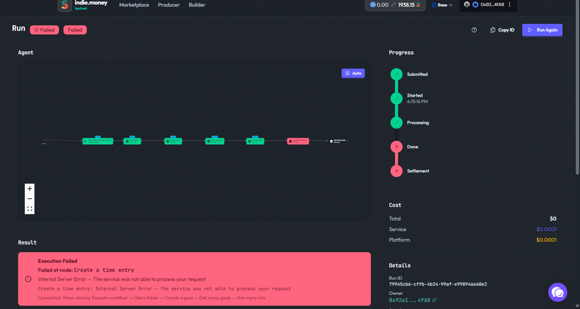 Workflow execution fails at “Create a time entry” node with an internal server error, preventing successful operation.